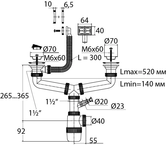 Сифон ЭЛИТ для двойной мойки с нержавеющими чашками D70 мм с отводом для стиральной или посудомоечной машины и с переливом 1'1/2 - D40