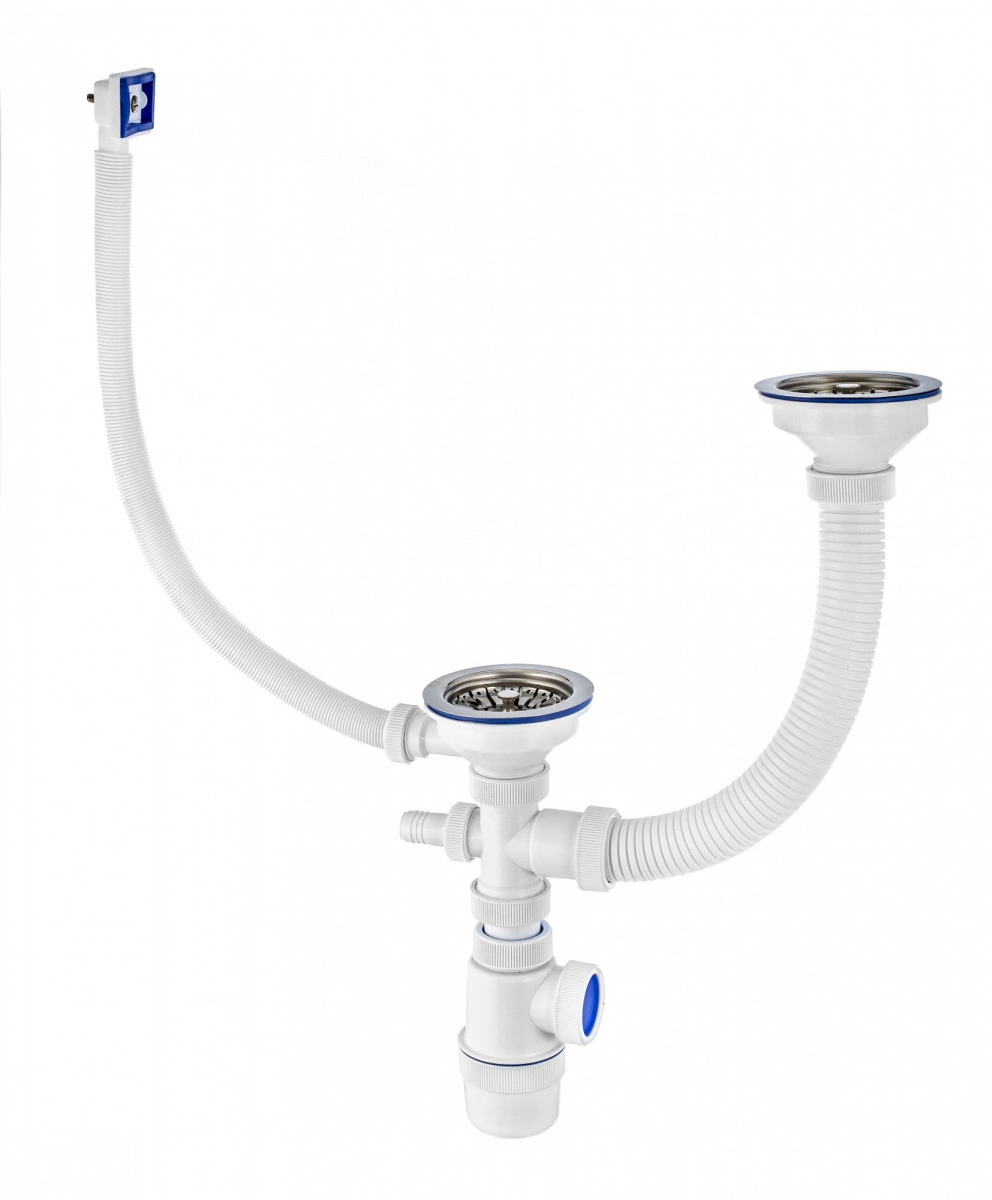 Сифон ЭЛИТ для двойной разноуровневой мойки с нержавеющей чашкой D114 мм с отводом для стиральной или посудомоечной машины и с переливом 3'1/2 - D40