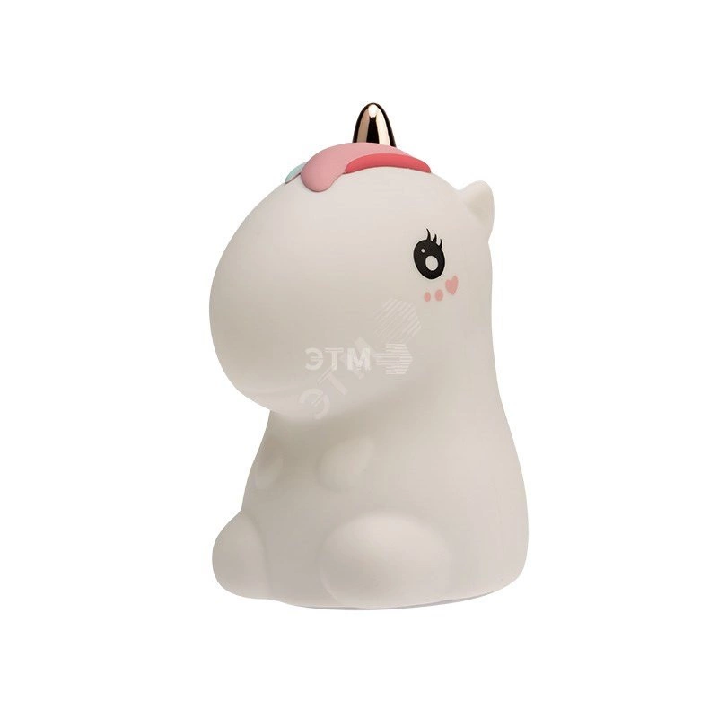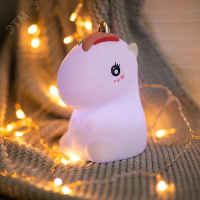 Беспроводной силиконовый ночник NEON-NIGHT ''Единорог'' не имеет запаха, выполнен из экологически чистых гипоаллергенных материалов. Благодаря технологии Soft-touch светильник приятно держать в руках, может использоваться в качестве игрушки. Ночник рассчитан на 3 режима - постоянное белое свечение теплого оттенка, плавная смена цветов RGB в диапазоне 256 оттенков, свечение одним из цветных вариантов. Смена опции осуществляется легким хлопком по корпусу. Силиконовый ночник заряжается через USB-порт (кабель в комплекте) и работает до 15 часов от одного заряда. В основании светильника расположена кнопка включения/выключения.