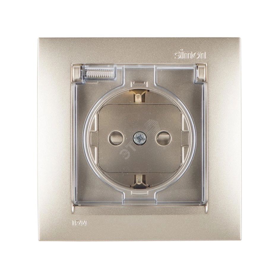 Simon15 Розетка с заземлением 2Р+Е защитные шторки и крышка IP44 16А 250В винтовые зажимы шампань