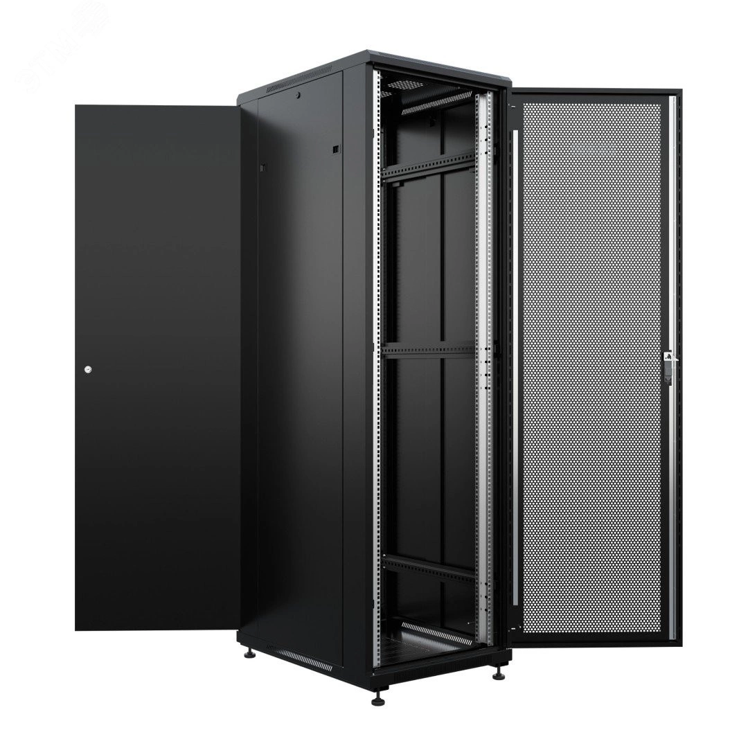 Задняя дверь на замке, боковые панели съемные на защелках|Монтажные профили имеют разметку в юнитах (U)|Регулируемые опоры в комплекте|Ригельный замок|Максимальная распределенная нагрузка – до 1200 кг|Увеличенный срок гарантии