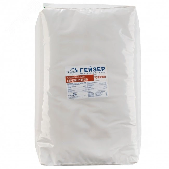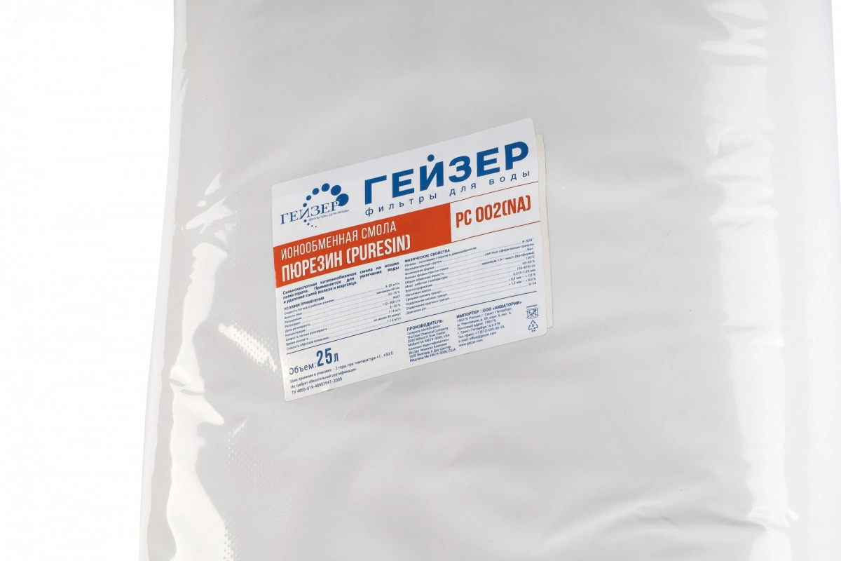 ПЮРЕЗИН РС 002 – сильнокислотная катионообменная смола для умягчения воды на основе полистирола. Обладает высокой ёмкостью и однородным гранулометрическим составом, может применяться как в промышленной, так и бытовой водоподготовке. Смола удаляет из воды ионы кальция и магния, заменяя их ионами натрия. После истощения ёмкости она может быть подвержена регенерации раствором поваренной соли. Последующая ёмкость смолы связана с дозой соли, использованной при регенерации. Наряду с солями жесткости с помощью смолы могут удаляться соли железа и марганца.