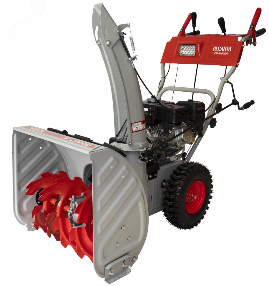 Снегоуборщик Ресанта СБ 4100ПФ предназначен для расчистки от выпавшего снега территории, например, небольшие дорожки или территорию возле загородного дома. Самоходный агрегат оборудован четырехтактным двигателем мощностью 7.0 л.с. Ширина обработки за один проход составляет 56 сантиметров. Рабочая система снегоуборщика Ресанта представляет собой снегозаборный желоб со шнеком, а также вентилятор в форме крыльчатки и желоб для выброса снега. Агрегат приводится в действие четырехтактным поршневым одноцилиндровым бензиновым двигателем внутреннего сгорания с воздушным охлаждением.