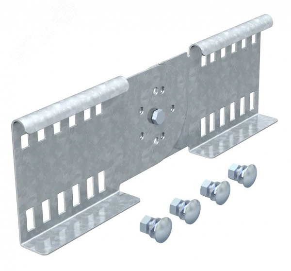 Шарнирный соединитель выступает в качестве внешнего крепления для фиксации кабельных лотков лестничного типа и фасонных деталей с высотой боковой стенки 110 мм и сквозной перфорацией стенки. Уголки регулируются по вертикали.