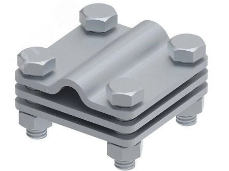 Соединитель крестовой 55х55 для параллельного, крестового и Т-образного соединения прутка диаметром 6-10 мм/полосы до 30 мм. С разделительной пластиной. Монтаж с помощью 4 винтов с шестигранной головкой M8 x 25 и 4 шестигранных гаек M8. Материал - горячеоцинкованная сталь.