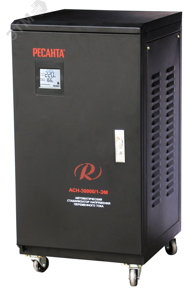 Стабилизатор напряжения РЕСАНТА АСН-30000/1-ЭМ электромеханического типа предназначен для выравнивания входного напряжения и защиты приборов от перепадов напряжения с суммарной мощностью до 30 кВт. Работает с напряжением 220В с точностью до +/-2%. Устройство оснащено фильтрами сетевых помех, предотвращающими искажение частотной синусоиды, микропроцессорным управлением и дисплеем, отображающим параметры напряжения. Превышение пределов поддерживаемого входного напряжения автоматически отключает подачу питания. Для дополнительной безопастности обладает термозащитой, которая позволяет выключиться стабилизатору при превышении его мощности нагрузки над мощностью самого устройства.