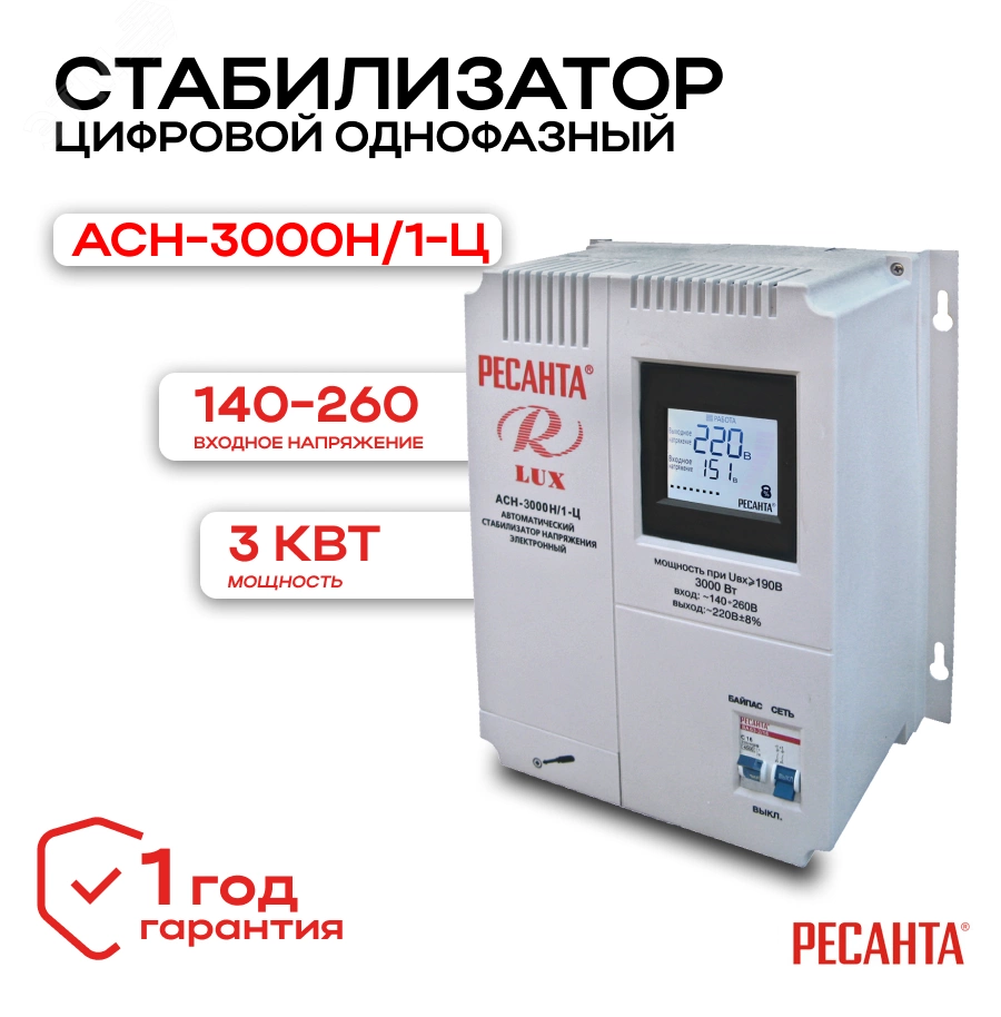 Стабилизатор серии LUX РЕСАНТА АСН-3000 Н/1-Ц - однофазный релейный стабилизатор для размещения на стене. Устройство выравнивает входящее напряжение и защищает электрические приборы от высоких скачков напряжения с суммарной мощностью до 3 кВт. Благодаря металлическому корпусу внутренние узлы защищены от механических повреждений. Стабилизатор Ресанта оснащен цифровым дисплеем, показывающим основные параметры работы. Для более эффективного охлаждения в конструкции прибора предусмотрен вентилятор. С помощью функции ''Байпас'' можно выключить устройство и подключить нагрузку в обход стабилизатора к питающей сети одним нажатием кнопки. Преимущества - -Аварийное отключение нагрузки при превышении максимальных показателей напряжения. -Контроль входного и выходного напряжения. -Термозащита. -Небольшие размеры. -Фильтрация сетевых помех на входе и выходе. -В комплект входит коплект крепления для монтажа на стену.