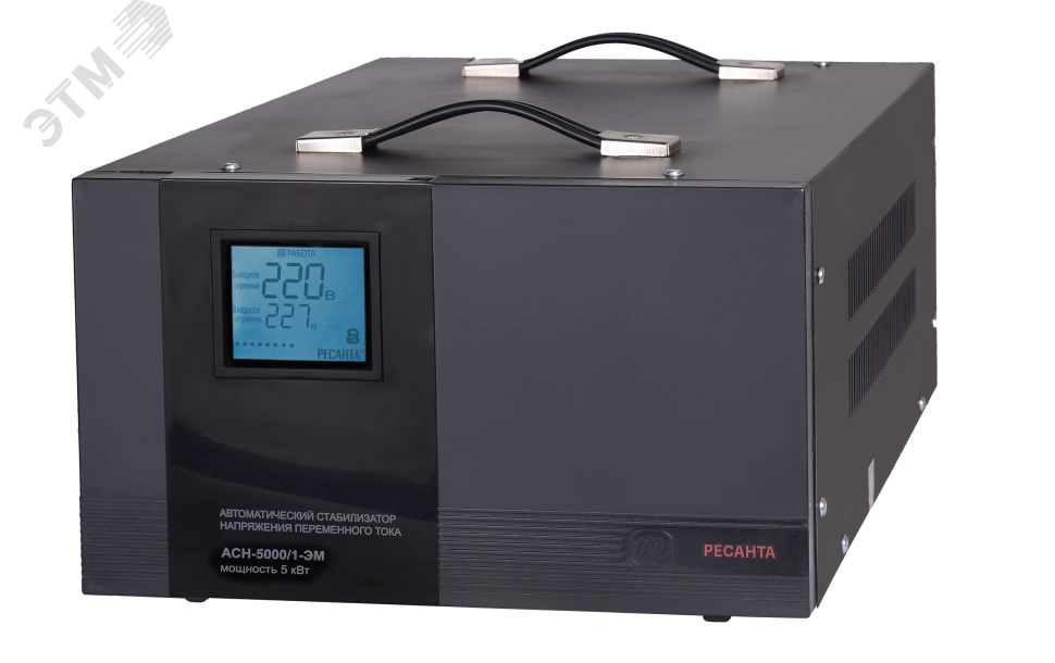 Стабилизатор напряжения РЕСАНТА АСН-5000/1-ЭМ электромеханического типа предназначен для выравнивания входного напряжения и защиты приборов от перепадов напряжения с суммарной мощностью до 5 кВт. Работает с напряжением 220В с точностью до +/-2%. Устройство оснащено фильтрами сетевых помех, предотвращающими искажение частотной синусоиды, микропроцессорным управлением и дисплеем, отображающим параметры напряжения. Превышение пределов поддерживаемого входного напряжения автоматически отключает подачу питания. Для дополнительной безопастности обладает термозащитой, которая позволяет выключиться стабилизатору при превышении его мощности нагрузки над мощностью самого устройства.