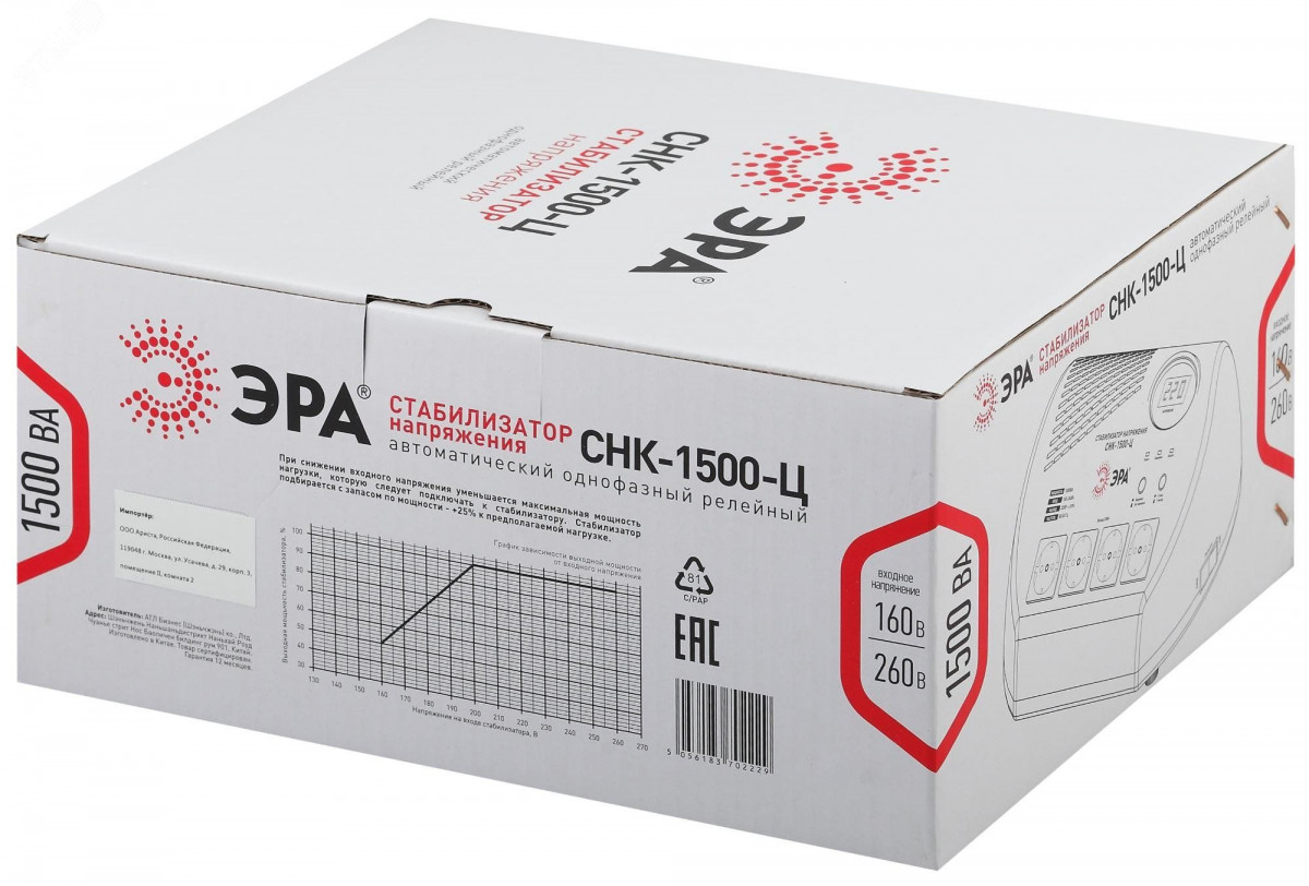 Стабилизатор напряжения компактный однофазный релейный цвет черный модели СНК-1500-Ц. Номинальные характеристики (полная мощность / диапазон входного напряжения) - 1500ВА 160-260В . Предназначен для поддержания стабильного однофазного напряжения питания бытовых приборов при отклонениях значений сетевого напряжения. Выбирая стабилизатор, нужно знать, какое электрооборудование будет к нему подключено - один прибор, группу приборов (наиболее чувствительных к перепадам напряжения в сети) либо вся домашняя (офисная) техника. Затем необходимо рассчитать суммарную мощность защищаемых электропотребителей. Основное условие выбора мощности стабилизатора напряжения - суммарная мощность подключаемой к нему нагрузки не должна превышать полной мощности самого стабилизатора (в противном случае автоматика стабилизатора будет их просто отключать).