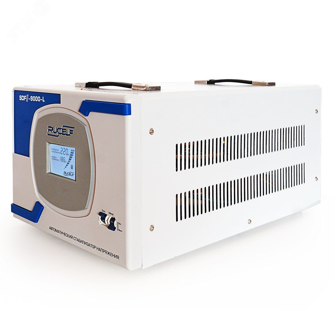 Стабилизаторы RUCELF относятся к электромеханическому типу стабилизаторов, обеспечивающих плавное регулирование выходного напряжения с высокой точностью его поддержания. Регулирование обеспечивается сервоприводом, автоматически отслеживающим изменение входного напряжения. Выходное напряжение измеряется и сравнивается с эталонным напряжением блока управления. Если имеется отклонение, тогда начинает работать серводвигатель, настраивая добавочное напряжение так, чтобы напряжение на выходе приняло эталонное значение. Величина добавочного напряжения, в зависимости от колебания входного, либо прибавляется, либо вычитается из искаженного сетевого напряжения. На передней части стабилизатора расположен жидкокристаллический дисплей, а также, сетевой автоматический выключатель ''СЕТЬ'', и сетевой автоматический выключатель ''ОБХОД'' предназначенный для не стабилизированного транзитного входного напряжения.