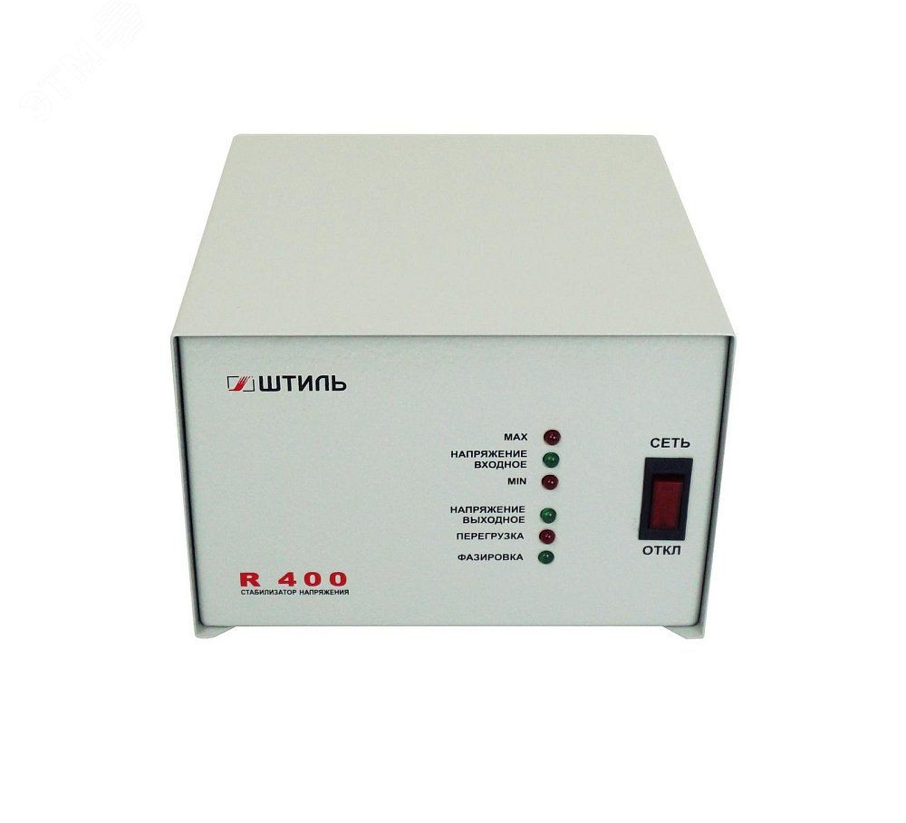 "Стабилизатор напряжения ""Штиль"" R 400 предназначен для защиты бытовой, офисной и промышленной техники, суммарная электрическая мощность которой не превышает 400 ВА (телевизоры, компьютеры, факсимильные аппараты, офисные АТС и т.д.). При подключении электродвигателей (имеются в составе холодильников, стиральных машин, насосов, компрессоров, моек высокого давления, электроинструмента) с прямым пуском стабилизатор напряжения должен иметь минимум полуторакратный, а лучше трехкратный, запас мощности относительно мощности электродвигателя."