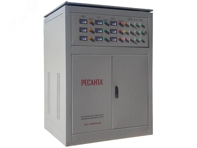Трёхфазный стабилизатор напряжения электромеханического типа Ресанта АСН-150 000/3 предназначен для выравнивания сетевого напряжения в диапазоне от 240 до 430 В до номинального в 380 В трехфазной сети. Точность стабилизации составляет ±2%. Стабилизатор рассчитан на номинальную нагрузку в 150 кВт. Частотные помехи на входе и выходе нивелируются встроенными фильтрами. Стабилизатор выполнен в металлическом корпусе. Для охлаждения устройства предусмотрены вентиляционные отверстия в стенках корпуса. Аппарат защищён от перегрузок и перегрева. При значительном превышении входящего напряжения стабилизатор автоматически отключает подачу питания и автоматически возобновляет её после возвращения входного напряжения в рабочий диапазон.