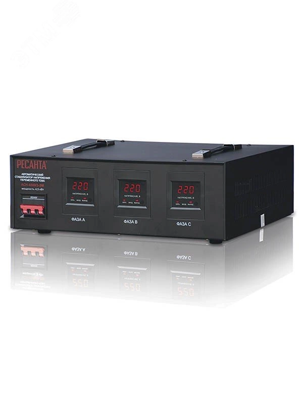 Трёхфазный стабилизатор напряжения электромеханического типа Ресанта АСН-4500/3 предназначен для выравнивания сетевого напряжения в диапазоне от 240 до 430 В до номинального в 380 В трехфазной сети. Точность стабилизации составляет ±2%. Стабилизатор рассчитан на номинальную нагрузку в 4.5 кВт. Стабилизатор оснащён 3-мя дисплеями для удобного контроля основных параметров. Частотные помехи на входе и выходе нивелируются встроенными фильтрами. Стабилизатор выполнен в металлическом корпусе. Для охлаждения устройства предусмотрены вентиляционные отверстия в стенках корпуса. Аппарат защищён от перегрузок и перегрева. При значительном превышении входящего напряжения стабилизатор автоматически отключает подачу питания и автоматически возобновляет её после возвращения входного напряжения в рабочий диапазон.