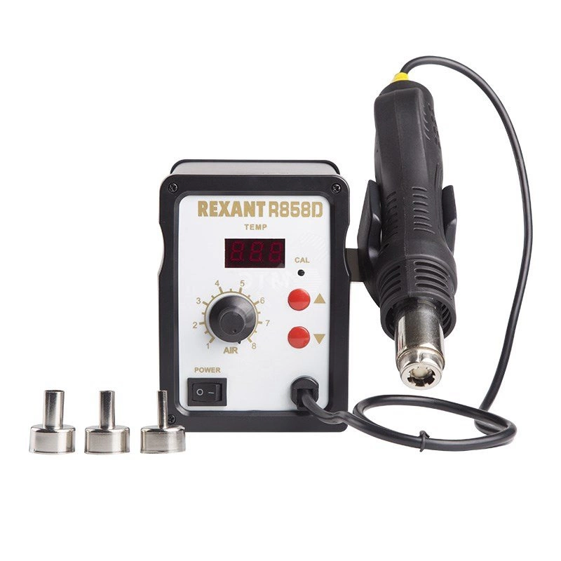Термовоздушная паяльная станция (паяльный фен) (R858D) применяется для демонтажа или пайки различных видов компонентов таких как SOIC, PLCC, QFP, BGA и т.д. Оснащена микрокомпьютером для цифрового отображения данных и контроля температуры с точностью до 1 градуса. Быстрый и равномерный разогрев, регулировка интенсивности обдува. Автоматическая продувка по окончании работы для охлаждения нагревательного элемента. Компрессор и нагревательный элемент находятся в ручке фена. Комплектация станции - основной блок, термофен, держатель термофена, 3 насадки разного размера.