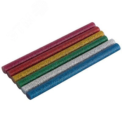 В наборе - 6 шт. Диаметр - 7 мм, длина - 100 мм. Цветные с блестками. Предназначены для использования в термопистолетах. Термоплавкий клей (стержни) на основе этиленвинилацетата (EVA). Упаковка - хеддер+пакет.