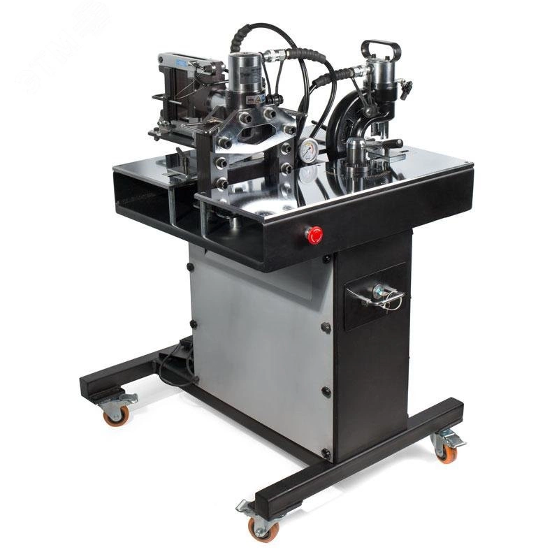 Предназначен для комплексной обработки электротехнических шин шириной до 150 мм. Станок совмещает в себе три операции - гибка, резка и перфорация шин. Конструкцией предусмотрено поочередное функционирование прессов. Функция автоматического сброса давления обеспечивает безопасную эксплуатацию. Все операции, производимые на станке, удобно производятся нажатием ножной педали. Максимальное давление - 700 бар. Производительность насоса - 1 ступень – 2.2 л/мин, 2 ступень – 0.2 л/мин. Объем маслобака - 5 л. Напряжение - 230 В / 50 Гц. Вес нетто - 200/160 кг.