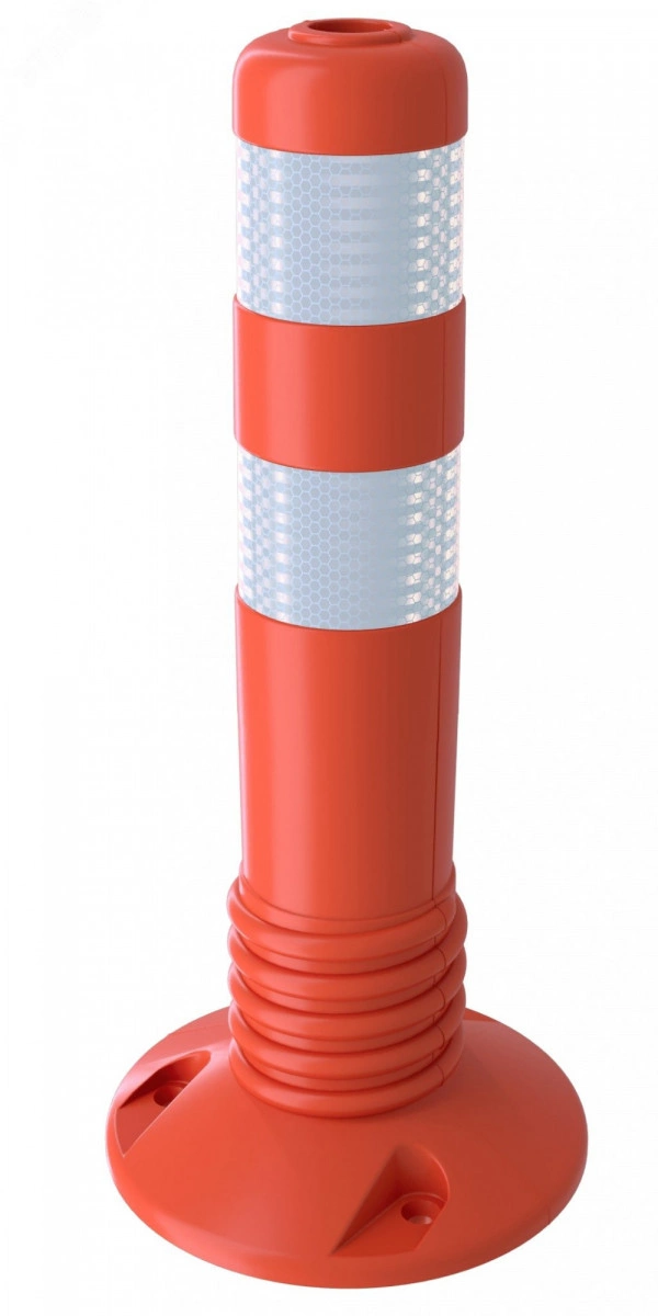 Гибкий дорожный столбик изготавливается из эластичных полимерных материалов. На корпусе столбика нанесена горизонтальная разметка из световозвращающей пленки, полосы нанесены по три штуки в горизонтальном порядке.