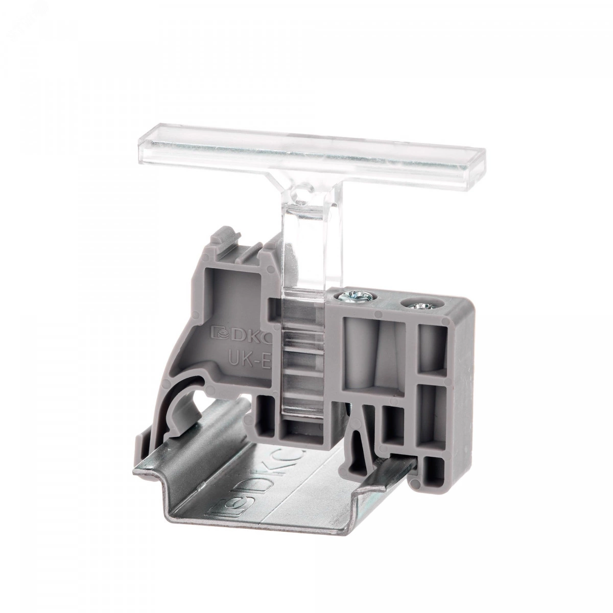 Торцевой фиксатор с винтовым зажимом из полиамида серого цвета толщиной 9,5 мм на рейку OMEGA 35 мм предназначен для фиксации и разделения клемм на рейке.