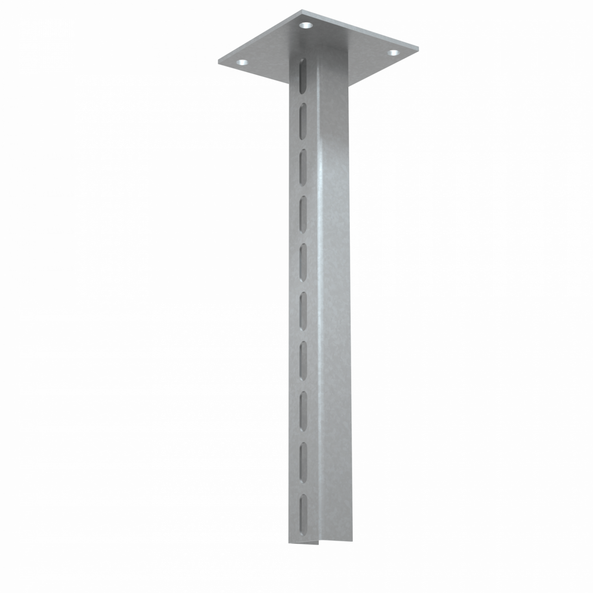 Серия элементов на основе п-образного профиля с приваренным на торце основанием, для крепления металлических лотков к несущей поверхности на любой высоте. Конфигурация изделий придаёт конструкции дополнительную жесткость и прочность. Стойка потолочная усиленная с перфорацией по основанию применяется для потолочного или напольного крепления кабельной трассы. Наличие перфорации по всей длине позволяет закреплять лотки на любой высоте. Изделие выполнено из стали и оцинковано электрохимическим способом. Предназначено для применения в местах предпочтительно с сухим климатом, внутри помещений и в слабоагрессивных средах, в соответствии с ГОСТ15150-69.