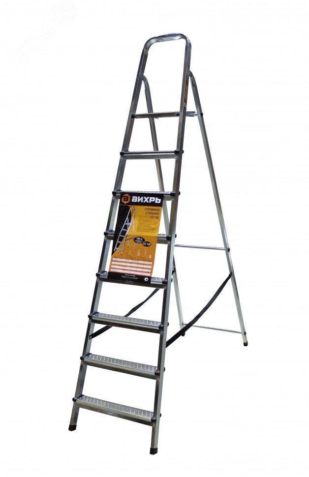 Стремянка стальная ВИХРЬ СС 1х8 - компактная и удобная в работе, широко применяется в быту. Прочный корпус изготовлен из стали. Покрыта гальваническим антикоррозийным покрытием. Чтобы стремянка не скользила, на опорах оборудованы заглушки. Ступени с рифленой поверхностью не позволят скользить во время работы стоящему на них человеку. Благодаря наличию высокой дуги пользователь может безопасно выполнять работу. В сложенном состоянии лестница занимает мало места, что удобно при хранении. Максимальная высота работы 3.69 м., высота площадки - 1.69 м.
