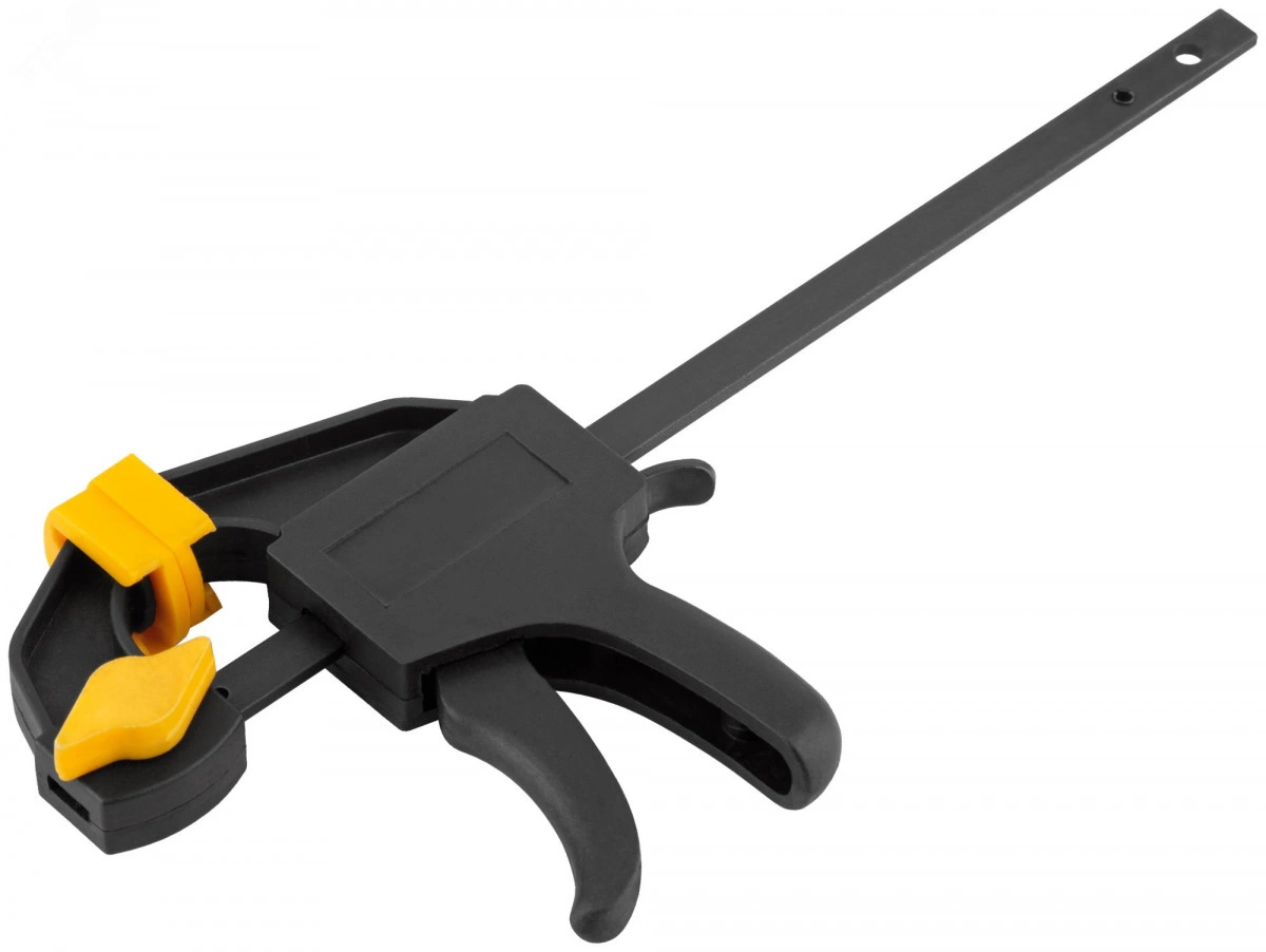 Быстрозажимная. Для фиксации деталей. Может использоваться как распорка при перестановке губок. Материал: нейлоновый корпус, армированный фибергласом, направляющая из инструментальной стали, пластиковые губки.