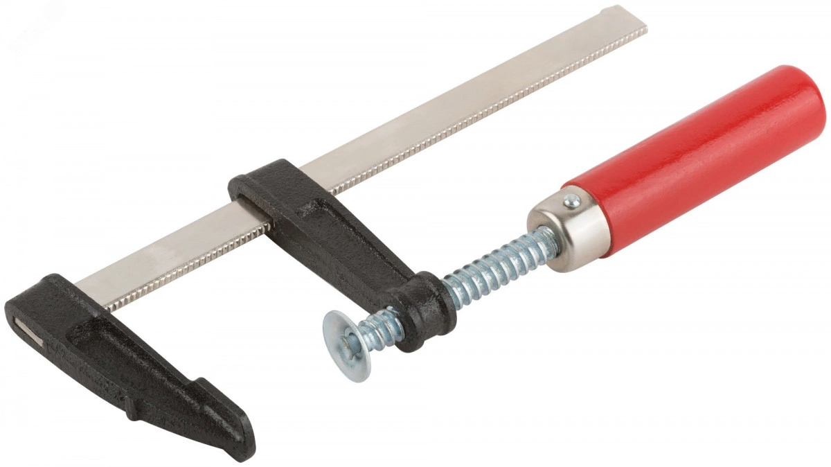 Струбцина типа F КУРС предназначена для фиксации деталей при проведении столярных, слесарных и других видов работ. F-образная конструкция отличается универсальностью и простотой использования. Струбцина изготовлена из качественной инструментальной стали, что обеспечивает ее прочность и долговечность. Пластиковые накладки на зажимных губках предотвращают повреждение детали. Деревянная рукоятка обеспечивает надежный хват.