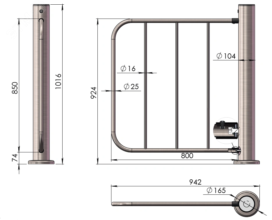 Створка электромеханической калитки 3V из нержавеющей стали. Калитка имеет световую индикацию на верхней части стойки, управляется с пульта или подключается к СКУД. Интеграция с любой системой контроля и управления доступом различных производителей без дополнительных адаптеров. Плата управления оснащена входом подключения к пожарной сигнализации. Проход сопровождается световым сигналом индикатора, расположенного на верхней части стойки калитки, и звуковым сигналом зуммера, расположенного в пульте управления. С пульта управления калитка может быть открыта на разовый проход, заблокирована в режиме открытой створки (свободный проход) или закрытом режиме (запрет прохода). Механизм оснащен ключом механической разблокировки.
