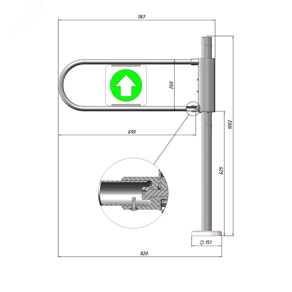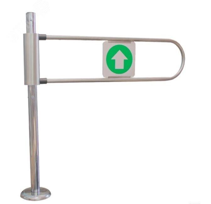 Односторонняя калитка с возвратом створки в исходное положение, которая используется для пропуска людей в одну сторону (выход/вход). Створка имеет заполнение с пиктограммами направления/запрета прохода. Калитка бывает правая/левая (по/против часовой стрелки). Основание крепится в четырех точках и закрывается декоративной крышкой из нержавеющей стали.