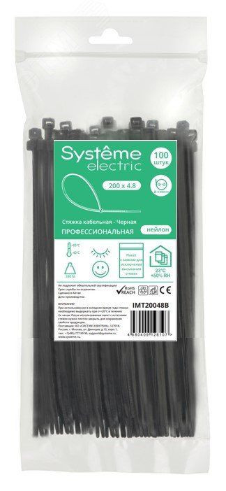 Кабельная стяжка Systeme Electric серии MultiSet в черном цвете предназначена для соединения кабелей и поводов в жгуты и их крепления к элементам строительных конструкций и кабельных лотков. Широко применяются для организации кабельных трасс в щитовом оборудовании. Температура эксплуатации - от -40 С до +85 С, поставляется упаковками по 100 штук в пакете с ЗИП-замком и имеет длину 200 мм и ширину 4,8 мм. Устойчивы к УФ-излучению и подходят для использования на открытых площадках.