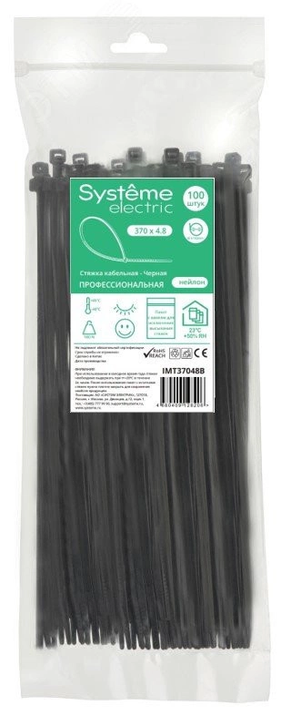 Кабельная стяжка Systeme Electric серии MultiSet в черном цвете предназначена для соединения кабелей и поводов в жгуты и их крепления к элементам строительных конструкций и кабельных лотков. Широко применяются для организации кабельных трасс в щитовом оборудовании. Температура эксплуатации - от -40 С до +85 С. Поставляется упаковками по 100 штук в пакете с ЗИП-замком и имеет длину 370 мм и ширину 4,8 мм. Устойчивы к УФ-излучению и подходят для использования на открытых площадках.