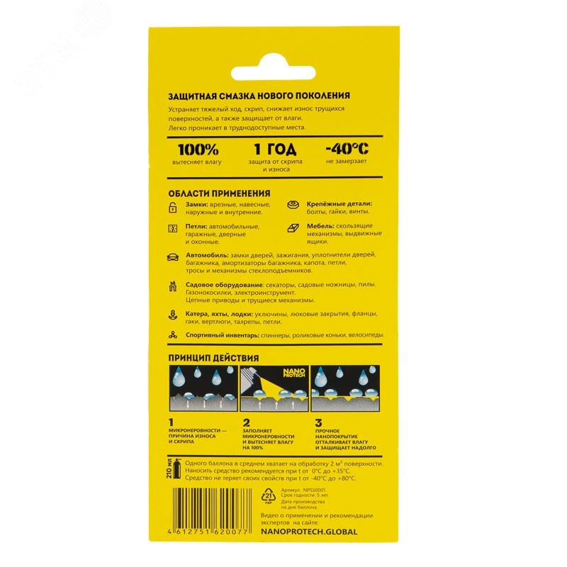 Проникающая смазка нового поколения. В отличие от обычных средств, проникает, смазывает и защищает действительно надолго. Прочное невидимое нанопокрытие гарантирует защиту от скрипа и износа минимум на 1 год. Рекомендуется использовать для смазки любых подвижных механизмов. Многократно продлевает срок эксплуатации устройств и оборудования.