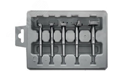 Сверла Форстнера, набор 5 шт. Для точного сверления сквозных и глухих отверстий в древесине и пластике. Материал - легированнаям инструментальная сталь, карбидные вставки. Упаковка - пластиковая коробка.
