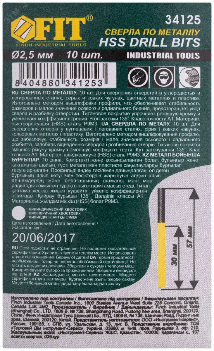 Цилиндрический хвостовик. Вышлифованный профиль. Класс точности А1. Угол заточки 135 градусов. Материал - быстрорежущая (HSS) сталь Р9М3 c титановым покрытием. Упаковка - картонный конверт.