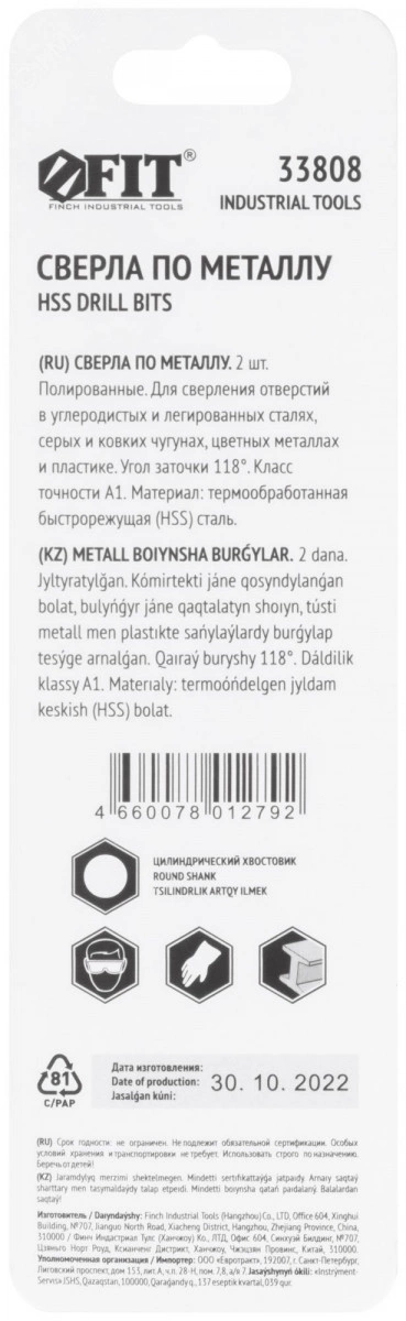 DIN 338. Цилиндрический хвостовик. Полированное. Угол заточки 118 градусов. Класс точности А1. Материал - быстрорежущая (HSS) сталь. Упаковка - блистер.