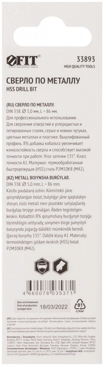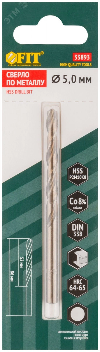Сверла по металлу HSS с добавкой кобальта 8% Профи ( М42 ) в блистере 5.0х86 мм ( 1 шт.)
