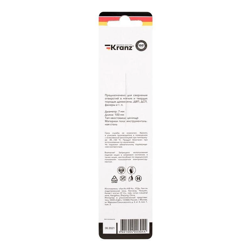 Сверло по дереву 7х105мм цилиндрический хвостовик Kranz KR-91-0736