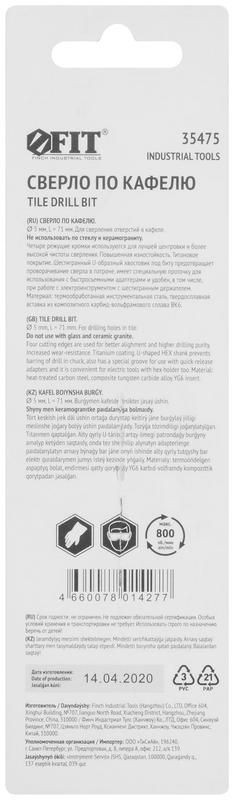 Полное описание: Сверло по кафелю 4 режущие кромки титан. покрытие U-хвостовик под биту 5х71мм FIT 35475