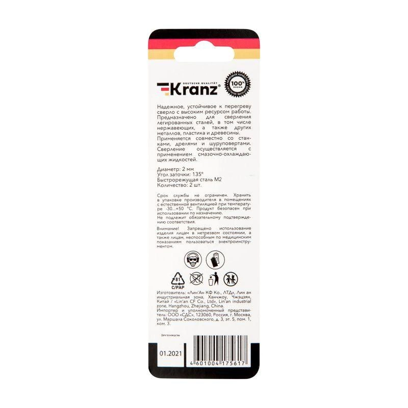 Сверло по металлу 2мм "Стандарт+" (P6M5 M-2) DIN 338 (блист.2шт) Kranz KR-91-0521