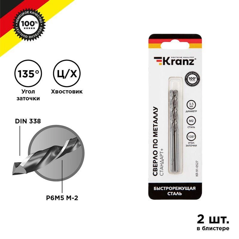 Сверло по металлу 3.5х70х39мм "Стандарт+" (P6M5 M-2) DIN 338 (блист.2шт) Kranz KR-91-0527
