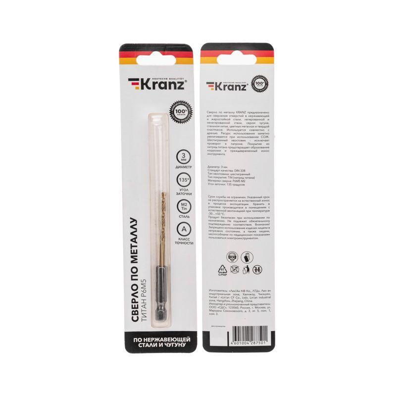 Полное описание: Сверло по металлу 3мм Р6М5 ТИТАН шестигранный хвостовик DIN 338 Kranz KR-91-5502