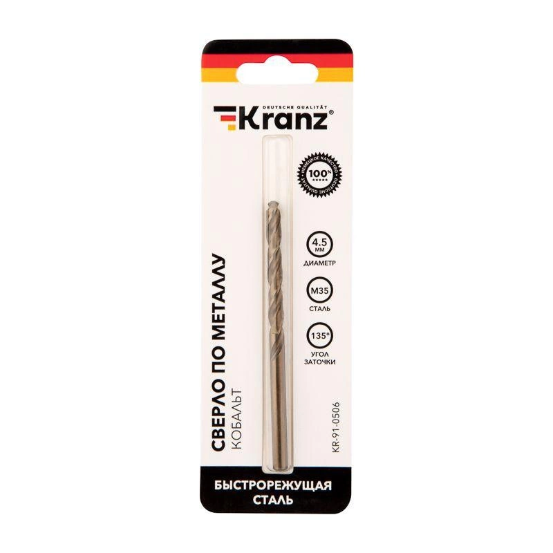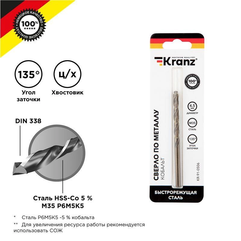 Полное описание: Сверло по металлу 4.5мм "Кобальт" (сталь HSS-Co 5% M35 P6M5K5) DIN 338 (блист.1шт) Kranz KR-91-0506