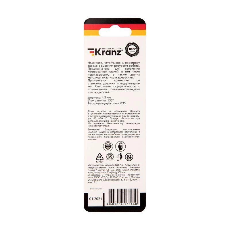Сверло по металлу 4.5мм "Кобальт" (сталь HSS-Co 5% M35 P6M5K5) DIN 338 (блист.1шт) Kranz KR-91-0506