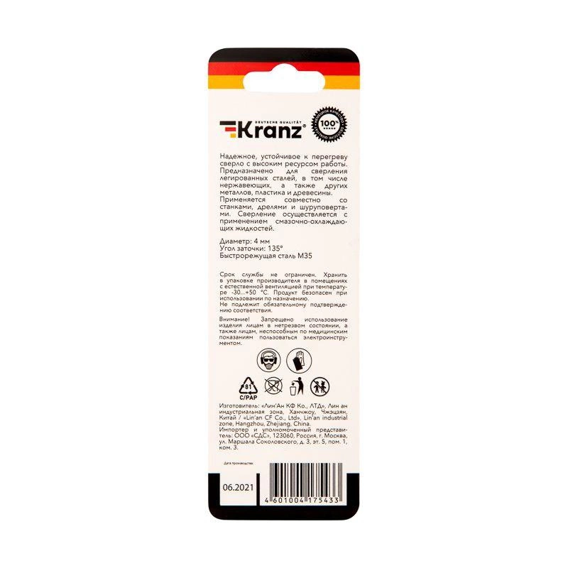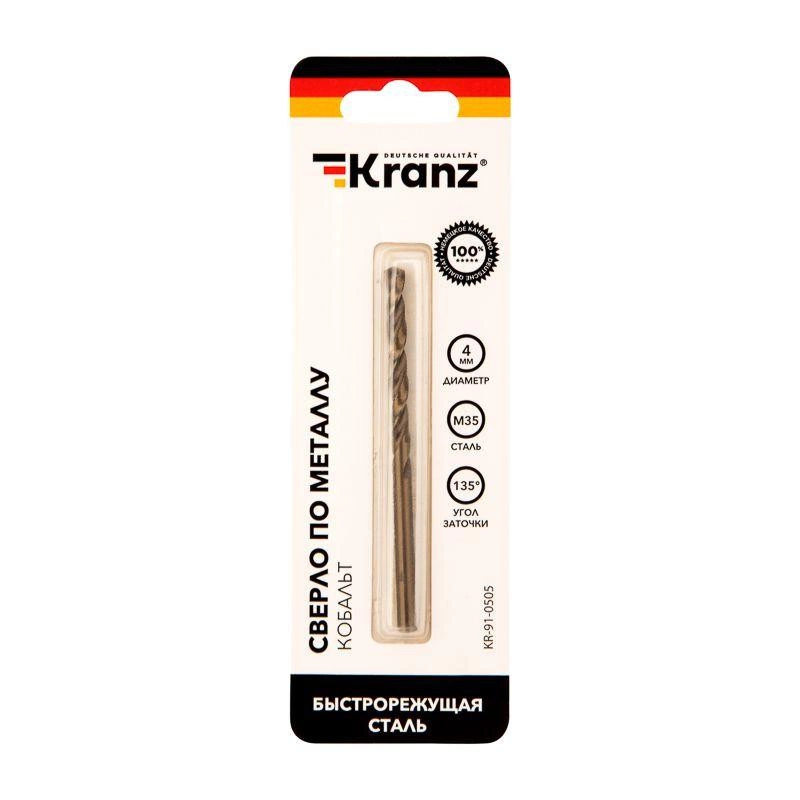 Сверло по металлу 4мм "Кобальт" (сталь HSS-Co 5% M35 P6M5K5) DIN 338 (блист.1шт) Kranz KR-91-0505
