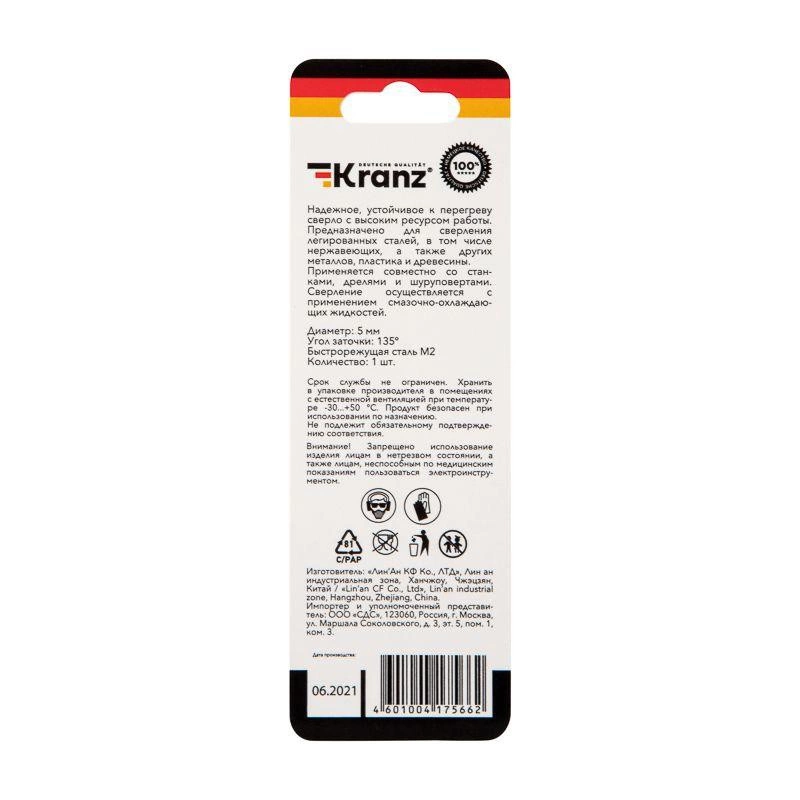 Сверло по металлу 5мм "Стандарт+" (P6M5 M-2) DIN 338 (блист.1шт) Kranz KR-91-0526