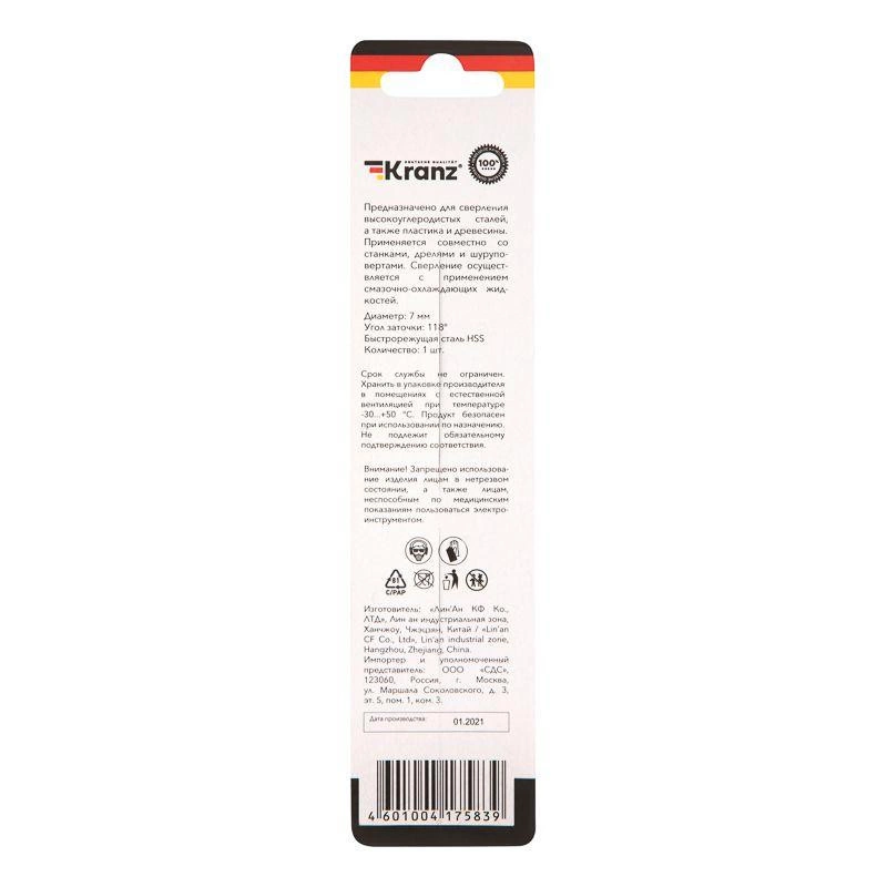 Сверло по металлу 7.0мм HSS DIN 338 (уп.1шт) Kranz KR-91-0568