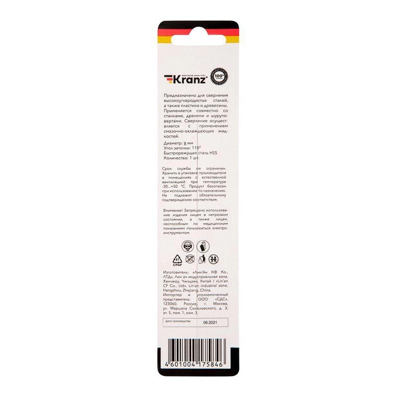 Сверло по металлу 8.0мм HSS DIN 338 (уп.1шт) Kranz KR-91-0570