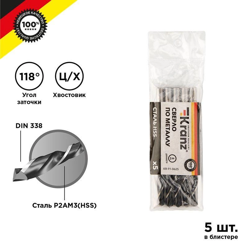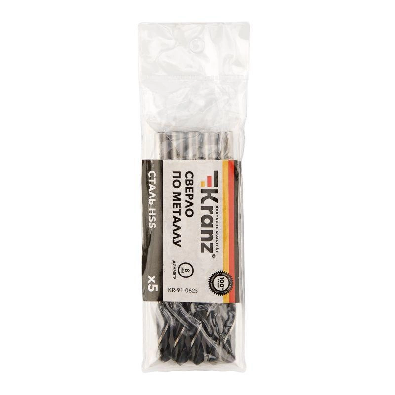 Сверло по металлу 8.0мм HSS DIN 338 (уп.5шт) Kranz KR-91-0625