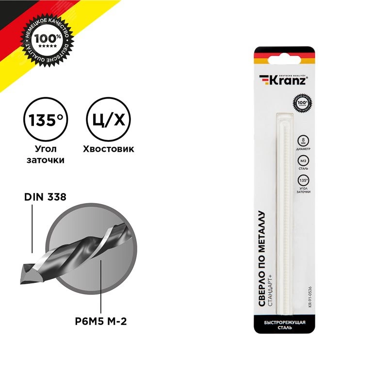 Сверло по металлу 8 мм 'Титан' (HSS-TiN M-2) (1 шт. в блистере). Сверло спиральное из быстрорежущей стали HSS-TiN M-2 по DIN 338, аналог P5M5, HRC 63. Праворежущее спиральное сверло, угол заточки 135 (предназначено для более твердых материалов и обеспечивает увеличение производительности на 40% по сравнению с углом 118), крестообразная подточка, не требуется предварительное кернение. Покрытие TIN препятствует быстрому нагреву при сверлении, что обеспечивает увеличение ресурса на 15-20% от аналогичного без покрытия. Сверла преимущественно предназначены для обработки металлов с твердостью 900-1100 МPa, легированная и нелегированная сталь, стальное литье, серый чугун, ковкий чугун, металлокерамика, цветные металлы, твердые пластмассы. Может ограниченно применяться для сверления нержавейки на минимальных скоростях и при обязательном использовании СОЖ.