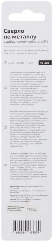Полное описание: Сверло по металлу Profi 7.5х109мм с кобальтом 5проц. Cutop 48-382