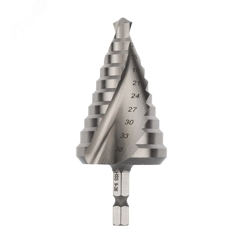 Ступенчатое сверло предназначено для получения отверстий различного диаметра без перестановки режущего инструмента. Применяется в работе с такими материалами, как пластик, дерево, металл и др. Хвостовик прибора имеет форму конуса. На каждой ступени есть маркировка фактического диаметра. Сверло изготовлено из инструментальной легированной стали и покрыто нитридом титана. Основные преимущества - повышенная точность, повышенная прочность, универсальность применения, высокий рабочий ресурс.